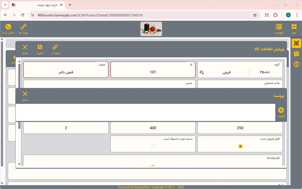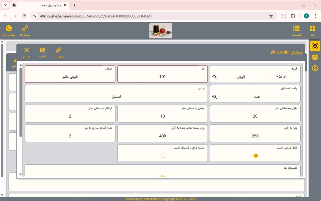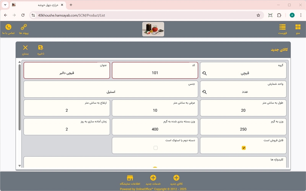 پس از ورود کد، عنوان و سایر تنظیمات کالا، بر روی دکمه ذخیره و بستن کلیک نمایید.