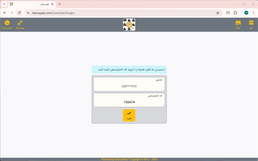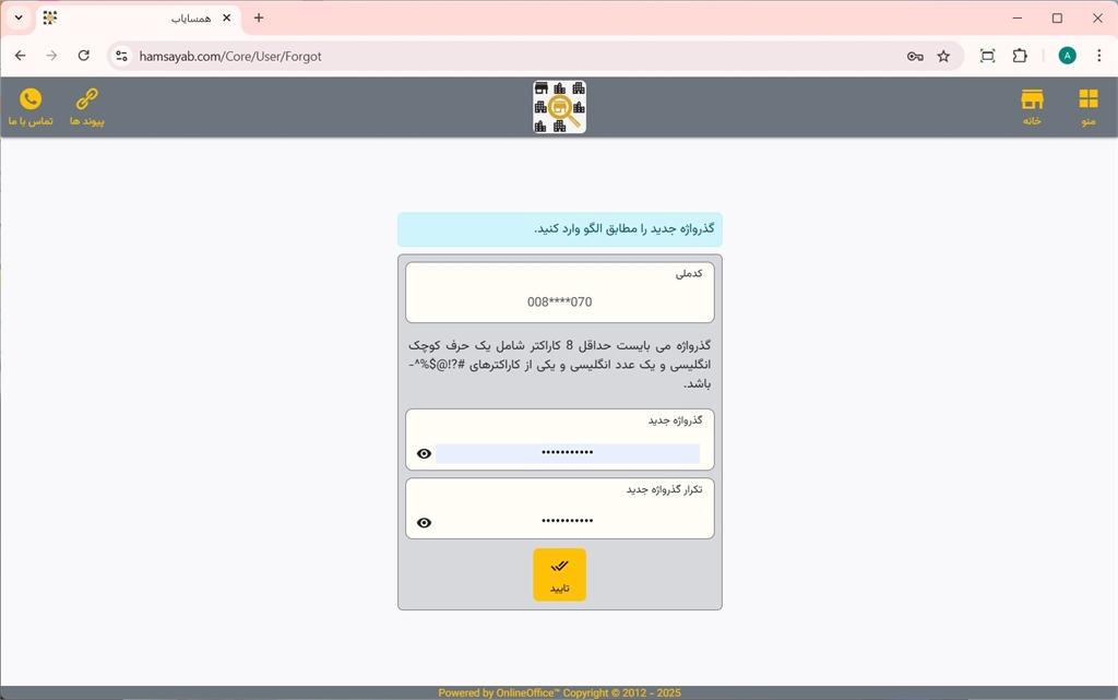 با استفاده از کدملی و گذرواژه وارد سایت همسایاب شوید.